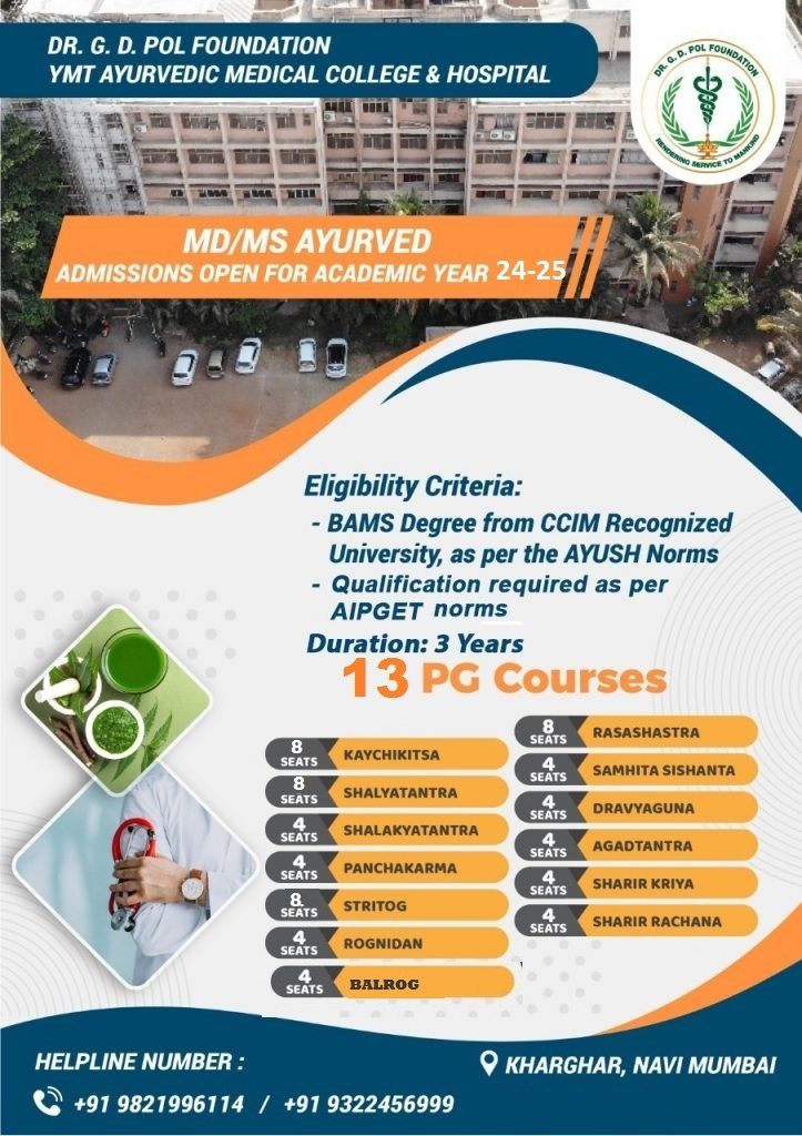 All the P. G. courses are recognized by Dept. of AYUSH of Ministry of Health and Family Welfare of Govt. of India and CCIM, New Delhi, and affiliated to M.U.H.S. (Nashik).